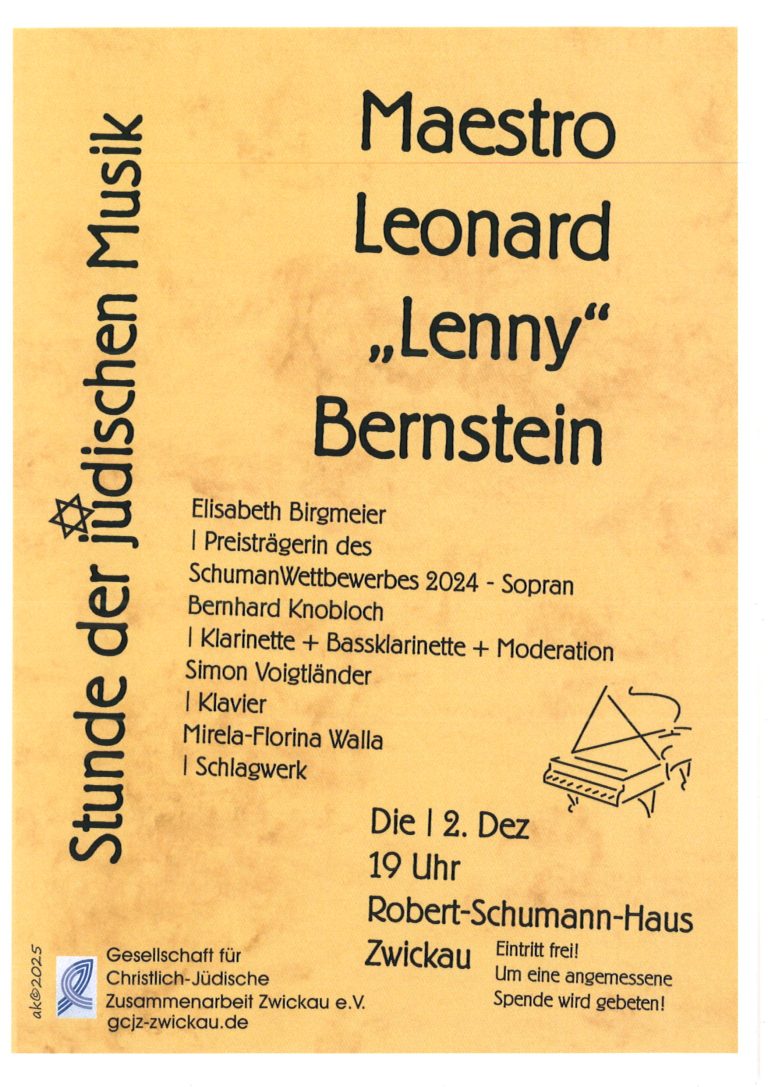 Die Christlich-Jüdische Zusammenarbeit Zwickau e.V. lädt ein zur Stunde der Jüdischen Musik Maestro Leonard „Lenny“ Bernstein am 2. Dezember 2025, 19:00 Uhr ins Robert-Schumann-Haus Zwickau